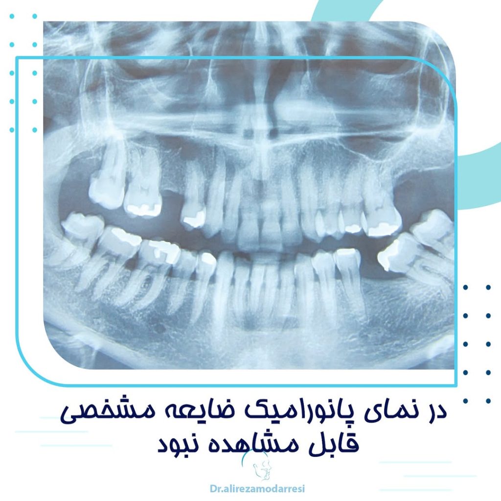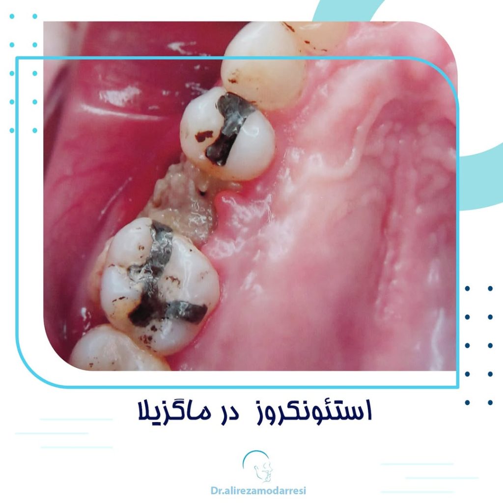 بیمار خانم58 ساله ای هستند که با شکایت از درد و تورم مختصر مراجعه کردند ، در سابقه پزشکی بیمار قید شده که به دنبال مشکلات تنفسی در بخش icu بیمارستان بستری و پس از ترخیص از بیمارستان متوجه این مشکلات در ناحیه باکال ماگزیلا سمت راست شدند ، و حتی به دنبال آنتی بیوتیک تراپی بهبود نیافته بودند . در بررسی بالینی تورم مختصر در ناحیه باکال بالا سمت راست در ناحیه پره مولر مشهود بود و استئونکروز در ناحیه مذکور قابل روئیت بود .