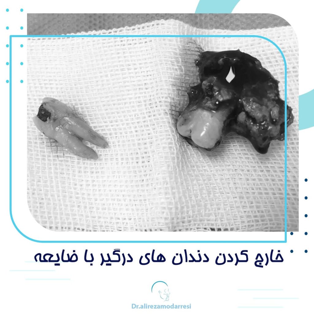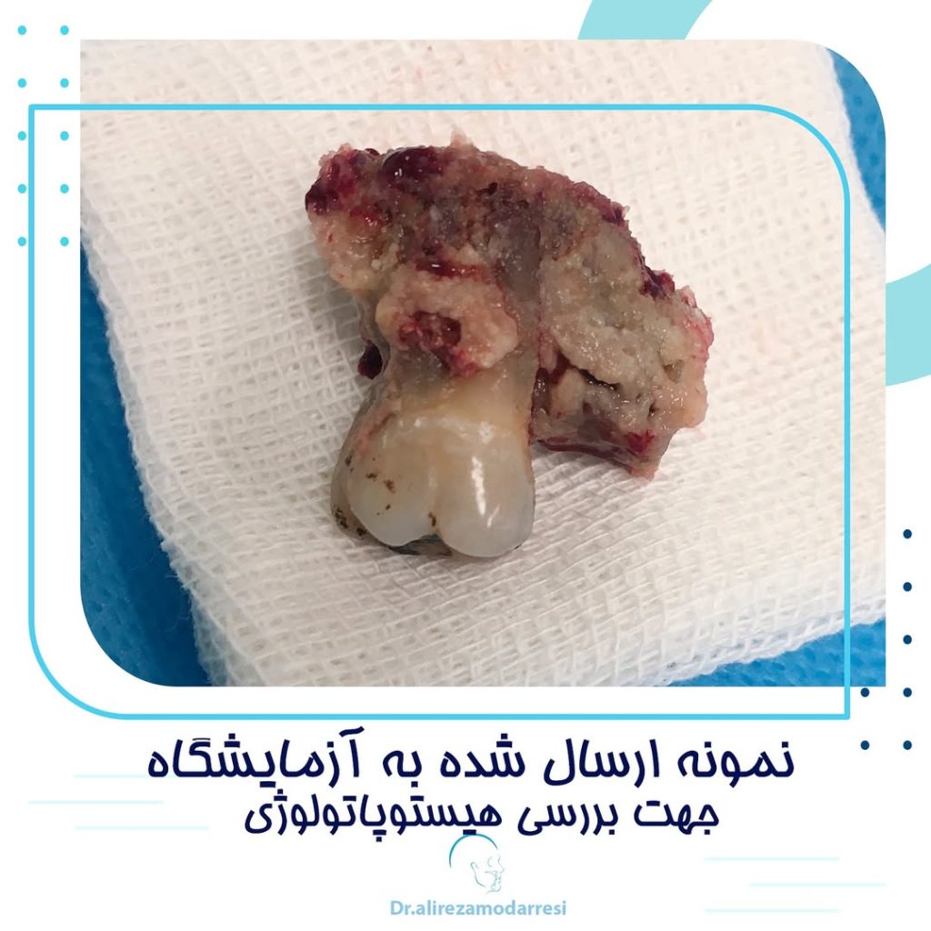 پس از بررسی opg و cbct و بررسی بالینی، جراحی خارج کردن ضایعه و دندانهای ۴ و شش بالا راست انجام شد و ضایعه جهت بررسی به پاتولوژی ارسال شد.